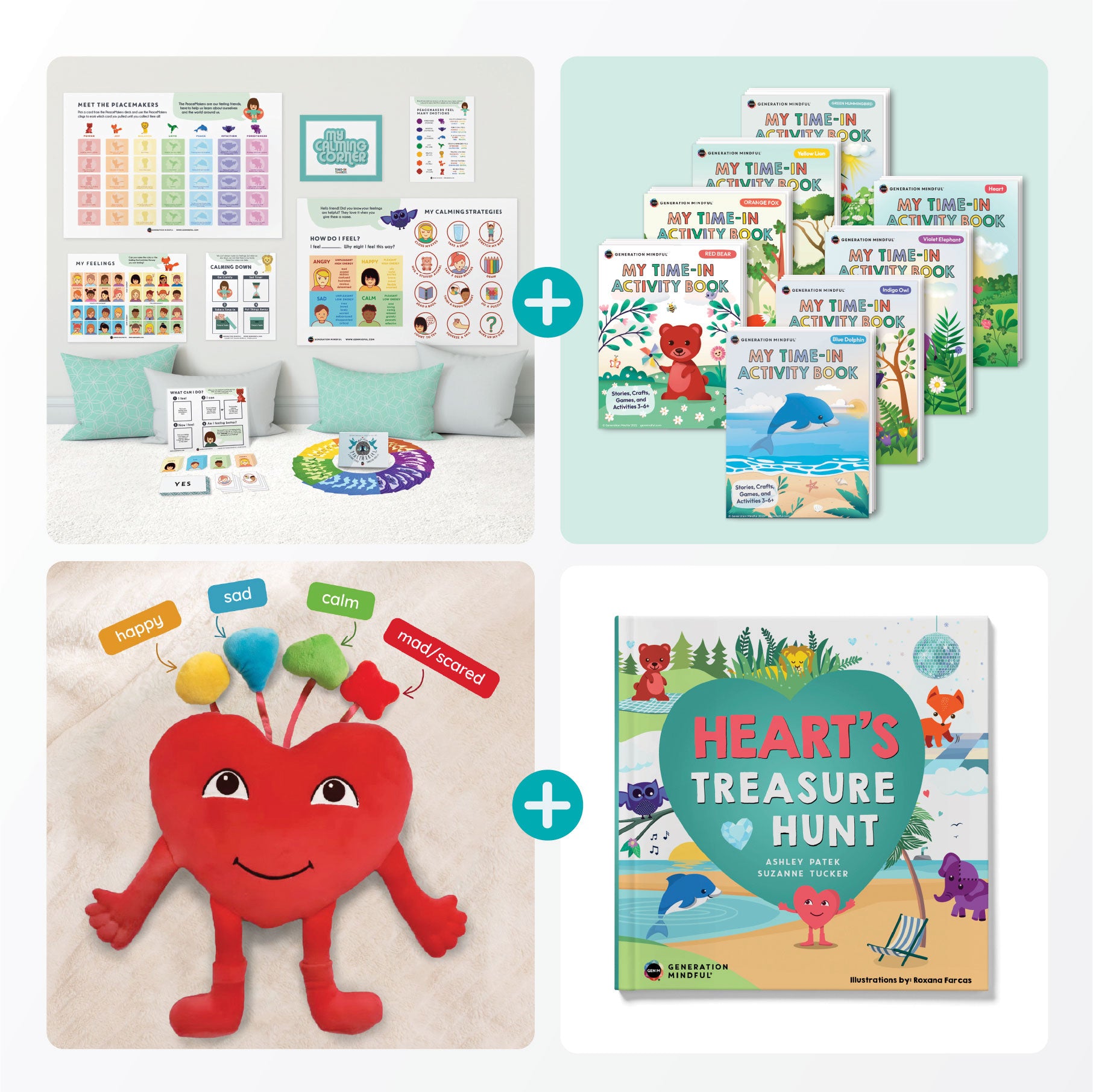Create the ultimate calming space in your home or classroom with these fun skill-building games and tools. The Calming Corner Bundle includes our world-famous Time-In ToolKit®, x1 SnuggleBuddies™ Emotions Plush, Heart's Treasure Hunt children's book, and the Time-In Activity Book Series (8 printable books total).