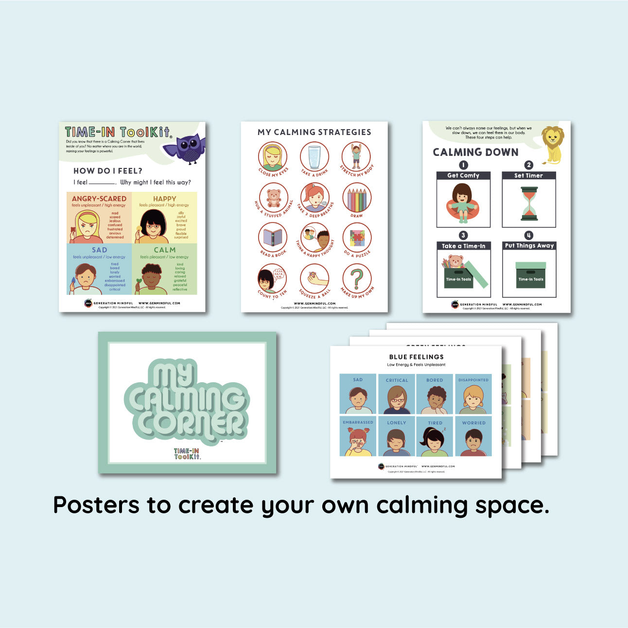 Your Digital Time-In ToolKit is available immediately after purchase and is a consolidated, downloadable, and streamable version of our physical ToolKits. Our physical Time-In ToolKits are shipped to you and include high-quality posters, card decks, laminated activity mats, and more. (See actual customer Calming Corners using our physical ToolKits above!)