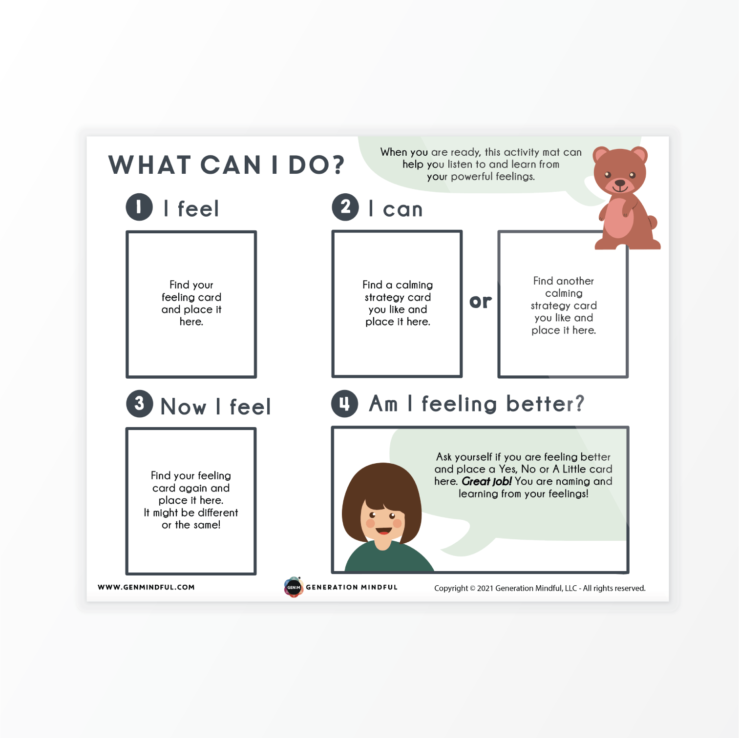 Children ages 3+ can use the this activity mat and card set to work through challenging moments and regulate their emotions.