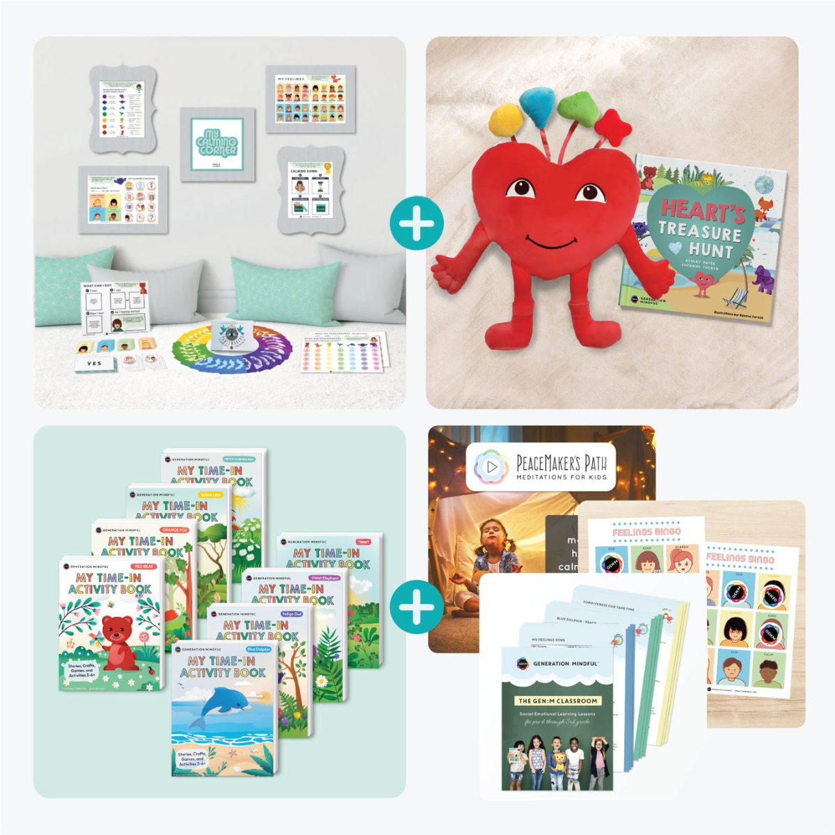 This Classroom ToolKit includes our best-selling Time-In ToolKit, Heart SnuggleBuddies Emotions Plush and Book, Standards-Aligned Lesson Plans, Feelings Bingo, and Storytime Meditations.